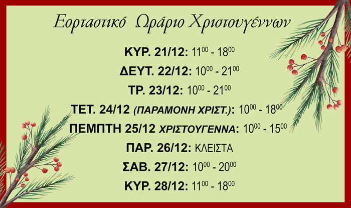 Ωράριο καταστήματος: Δευτέρα έως Παρασκευή 10:00 με 21:00,