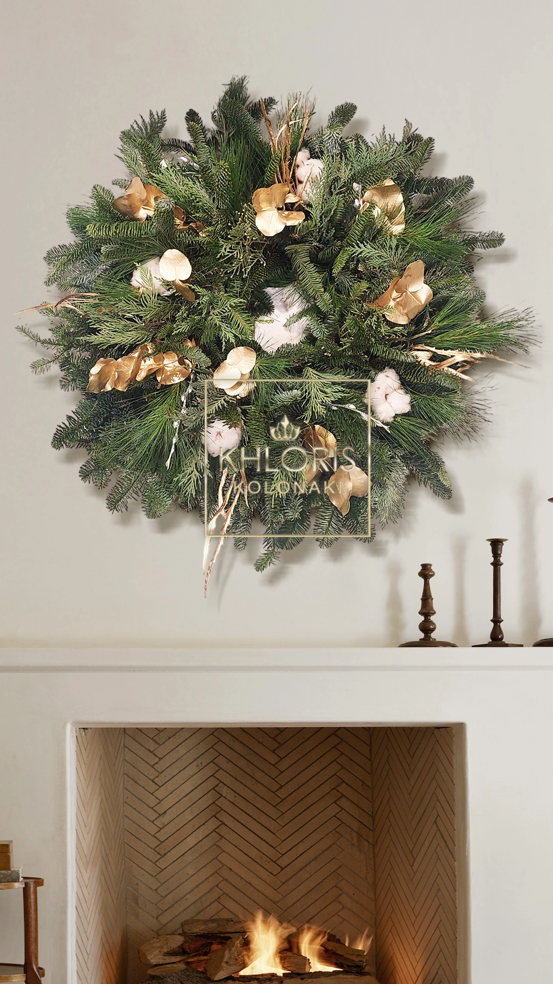 Χριστουγεννιάτικο στεφάνι Gold Cotton. Χριστουγεννιάτικο στεφάνι αληθινό, με Βαμβάκι, Ευκάλυπτο, Πεύκο, έλατο, τούγια, grevilea. Διάσταση: 60 εκ. κατά προσέγγιση.