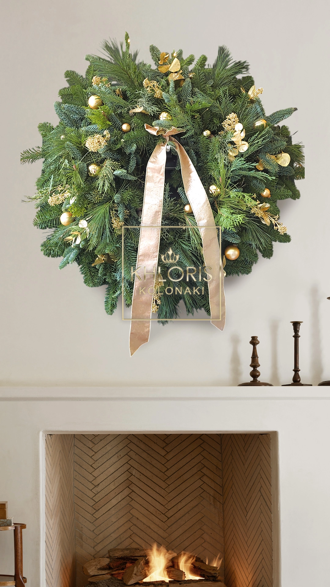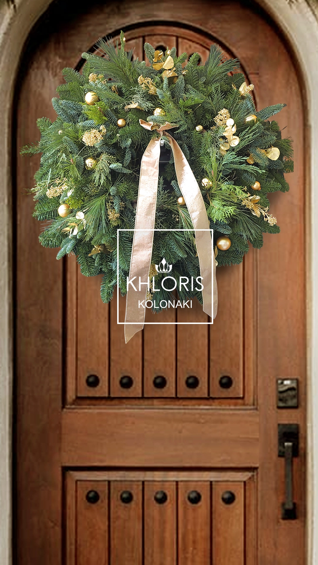 Χριστουγεννιάτικο στεφάνι Golden 25. Χριστουγεννιάτικο στεφάνι αληθινό, με Έλατο, Πεύκο, Τούγια, χρυσά αποξηραμένα φυτά και χρυσές μπάλες. Διάσταση: 60 εκ. κατά προσέγγιση.