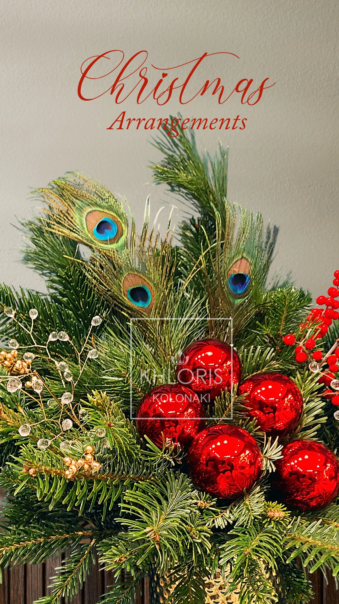Χριστουγεννιάτικη σύνθεση σε κεραμικό χρυσό κασπώ με Ελατο, φτερά παγωνιού, Πεύκο, τούγια, μπάλες και χριστουγεννιάτικα στολίδια. Διάσταση σύνθεσης: 45 εκ. κατά προσέγγιση.