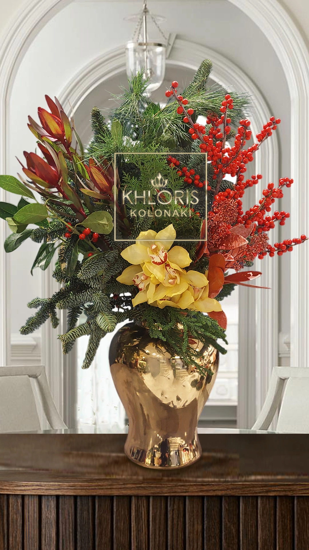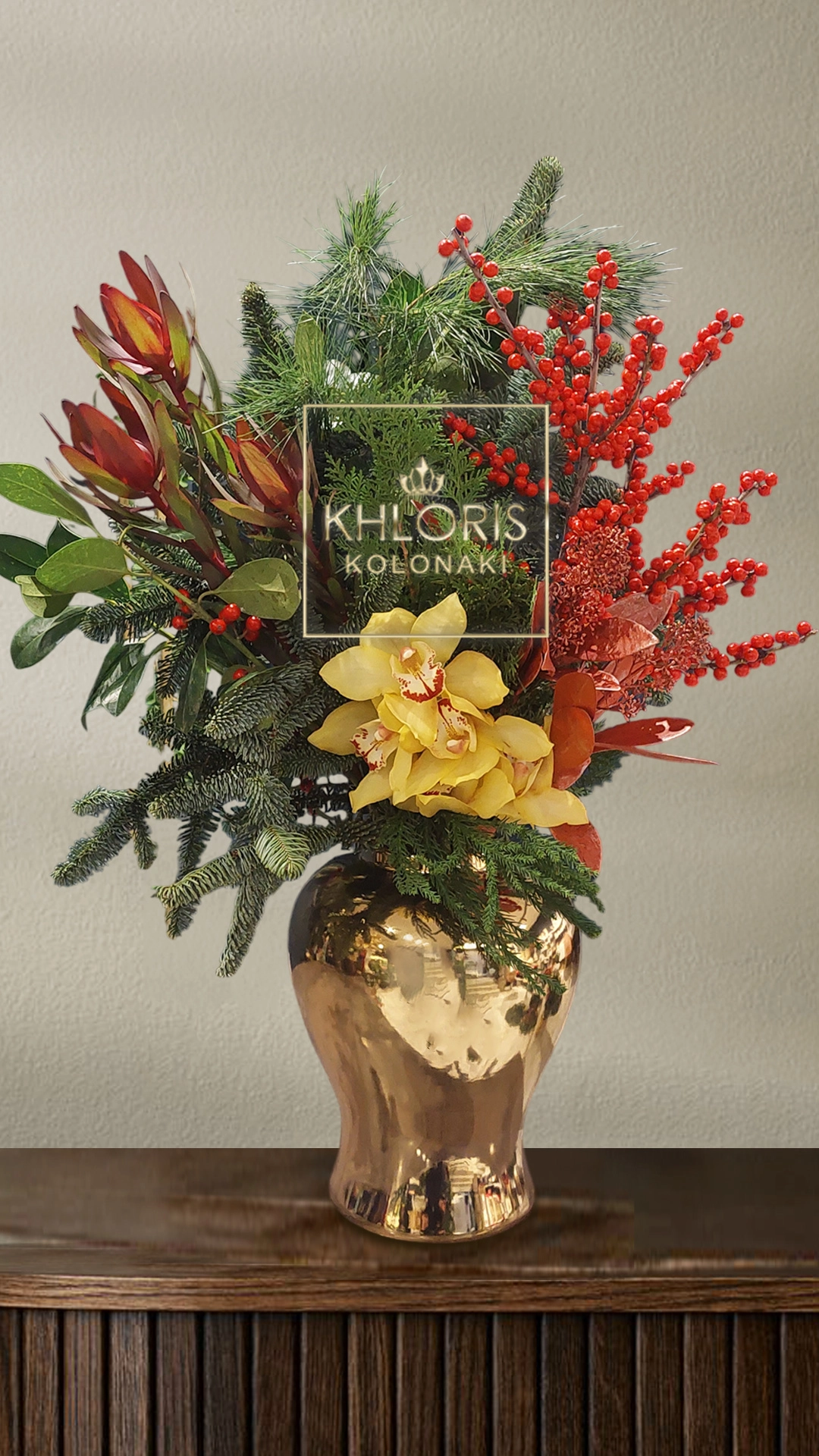 Σύνθεση New York. Χριστουγεννιάτικη σύνθεση σε χρυσό κεραμικό βάζο με Ιλεξ, Ελατο, Πεύκο, Λευκάδεντρο, Ορχιδέα sibidium, ου, Skimmia. Διάσταση (ύψος): 55 εκ. κατά προσέγγιση.