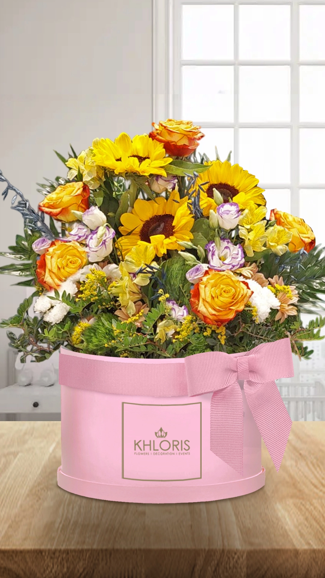 Σύνθεση Pink Sun με Ηλιοτρόπια, Ecuador τριαντάφυλλα, Λυσίανθους, Σολιντάγκο, Αλστρομέριες, Χρυσάνθεμα και φυλλώματα. Διάσταση σύνθεσης: 35 εκ. κατά προσέγγιση. Ανάλογα την εποχικότητα & διαθεσιμότητα, τοποθετούνται παραπλήσια λουλούδια, καλάθι, ίσης ή μεγαλύτερης αξίας.