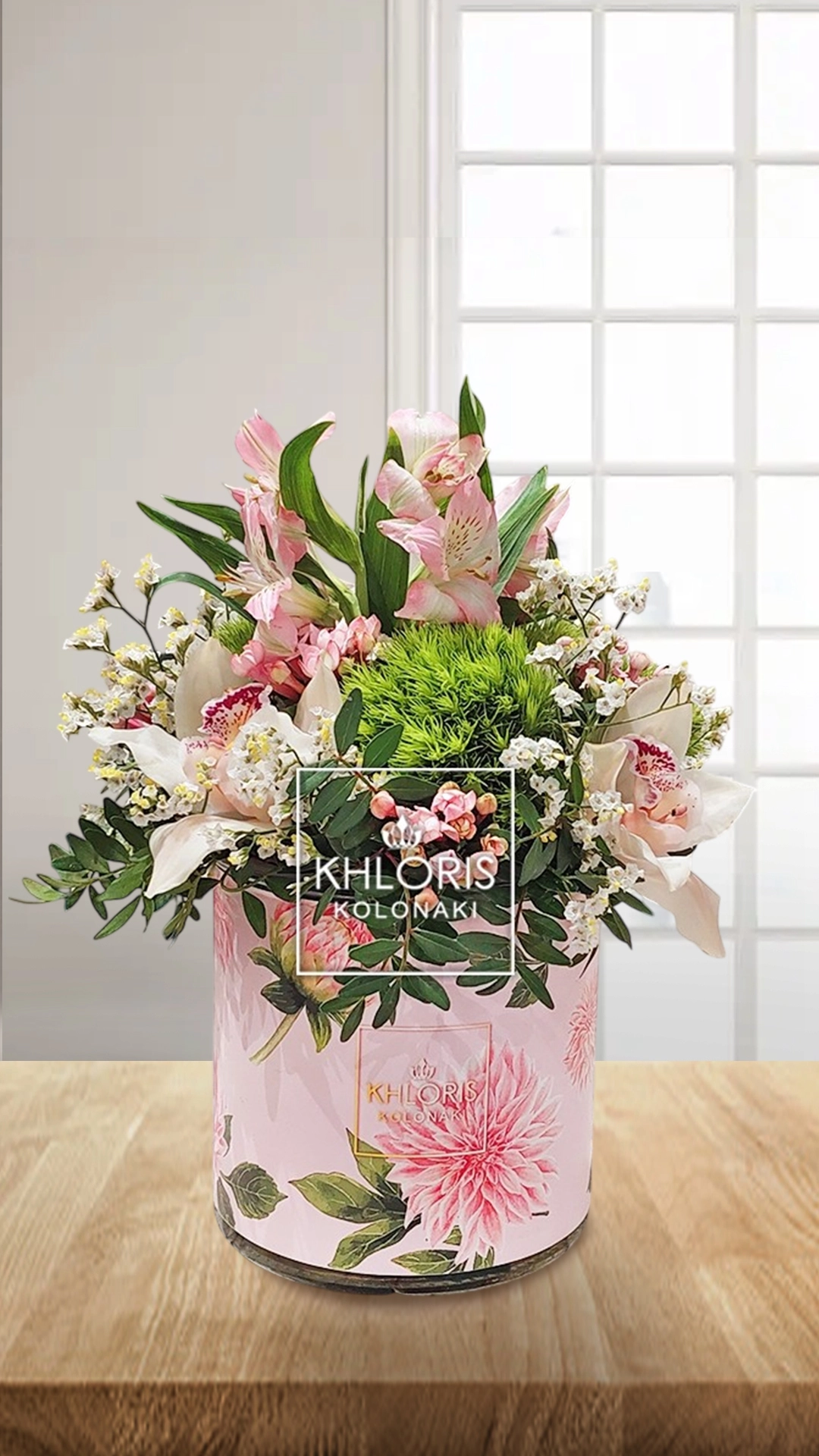 Σύνθεση Bella Rossa. Λουλούδια πολύχρωμα σε γυάλινο κασπώ με ροζ μοτίβο. Ανάλογα την εποχικότητα μπαίνουν παρεμφερή ανθη ίσης ή μεγαλύτερης αξίας στο ίδιο ύφος. Υψος σύνθεσης: 25 εκ. κατά προσέγγιση