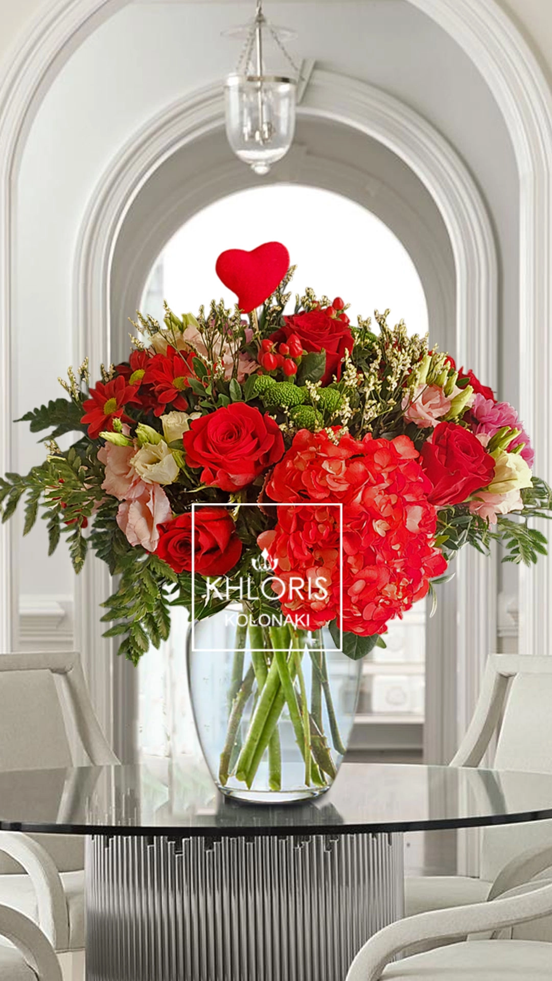 Μπουκέτο αγάπης! με Κόκκινη Ορτανσία, Λυσίανθους, Τριαντάφυλλα Εκουαδόρ, Υπέρικουμ, Limonium, Χρυσάνθεμα εισαγωγής και διάφορα φυλλώματα. Ανάλογα την εποχικότητα μπαίνουν παρόμοια λουλούδια. Δεν περιλαμβάνεται το βάζο στην τιμή.