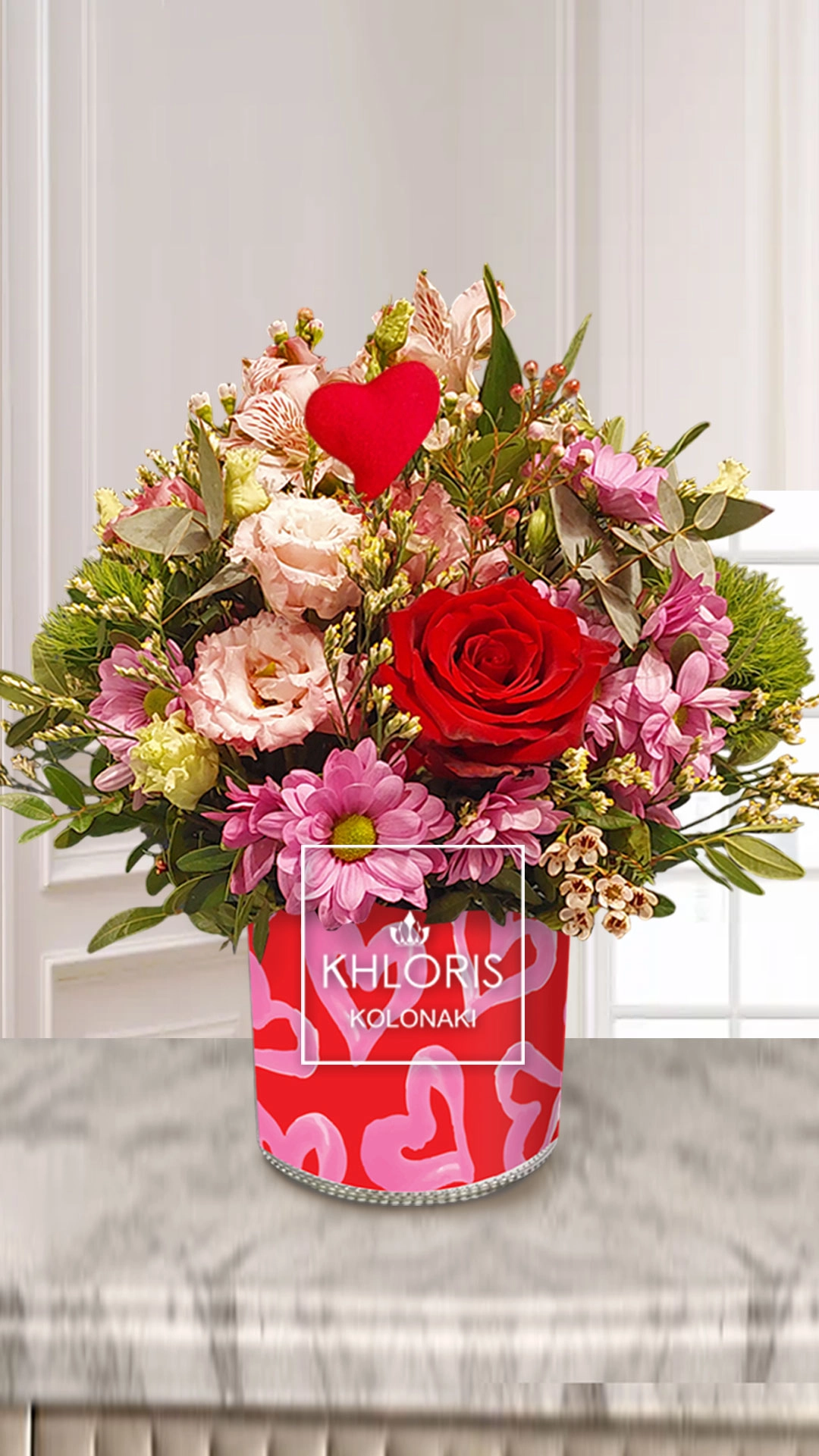 My Love Pot Κασπώ γυάλινο με καρδιές με κόκκινα Τριαντάφυλλα Εκουαδόρ, Wax, Limonium, Χρυσάνθεμα εισαγωγής και διάφορα φυλλώματα. Ανάλογα την εποχικότητα μπαίνουν παρόμοια λουλούδια.